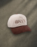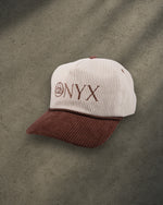 ONYX Beige and Brown Corduroy Snapback Hat with Brown "ONYX" Embroidery